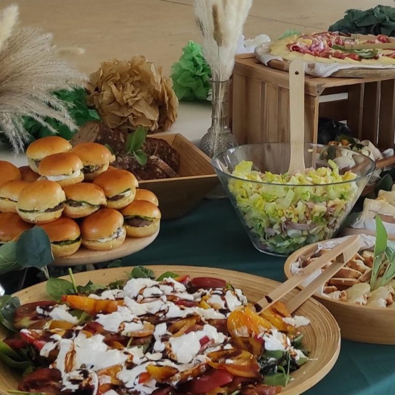 Mini viennoiseries, pancakes ou brioches perdues, mini muffins chocolat, plateaux fruits coupés, verrines fromage blanc muesli, plateaux charcuteries, fromages, pains, salade de taboulé, mini burgers de boeuf, demi bagel avocat saumon.