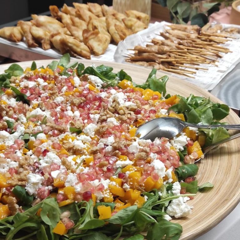 Le traditionnel buffet avec charcuterie, viande et salade, enrichi de tartes salées de saison. Il est tout à fait possible de mixer avec quelques mignardises comme les mini burgers par exemple.